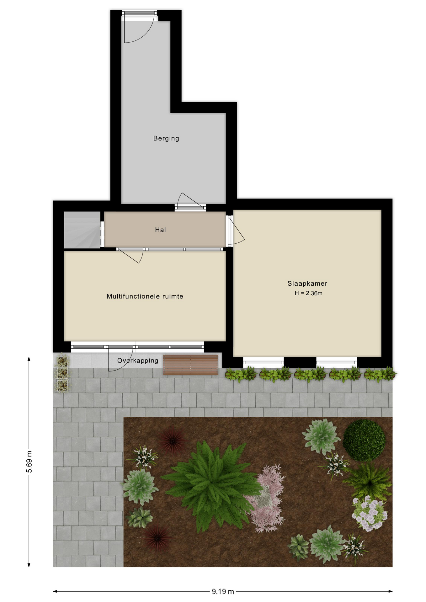 Via de straatzijde bereik je de woning door de fijne, zonnige tuin waar je heerlijk van het buitenleven kunt genieten. De entree geeft direct toegang tot een ruime kamer, uitstekend te gebruiken als slaapkamer of werkkamer. Vanuit deze ruimte bereik je de overloop met toegang tot een tweede kamer, ideaal als extra slaapkamer, hobbyruimte, gamekamer of mancave. Tevens is hier de berging bereikbaar, die ook via het binnenterrein toegankelijk is, bijzonder praktisch voor bijvoorbeeld het stallen van fietsen. Vanaf de overloop leidt de trap naar de bovenverdieping.