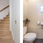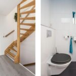 Overloop met laminaatvloer, glad gestucte wanden -en plafond, modern afgewerkte toiletruimte met hangend closet en fonteintje en vaste trapopgang naar de 2e verdieping.