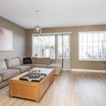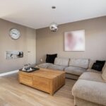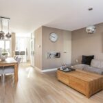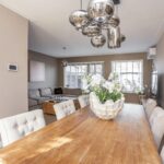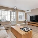 De tuingerichte en zeer ruime woonkamer is heerlijk licht door grote raampartij en tuindeur aan de achterzijde en het hoge raam aan de voorzijde. De living is voorzien van een mooie, houtlook tegelvloer met vloerverwarming, glad gestucte wanden -en plafond, airco-unit en praktische trapkast.