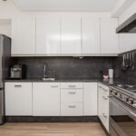 De keuken ligt aan de voorzijde van de woning, heeft een modern blok in hoekopstelling en is uitgerust met een RVS gasfornuis met 5 pitten en elektrische oven, RVS-afzuigkap, vaatwasser, Quooker, losse RVS koel-/vriescombinatie en veel werk- en kastruimte.