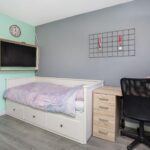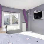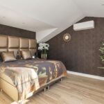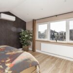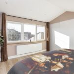 De slaapkamer aan de voorzijde voelt aan als een luxe en comfortabele hotelsuite en is eveneens prachtig afgewerkt. Door het hoge plafond wordt het grote oppervlakte extra benadrukt en door de eigen airco-unit blijft de temperatuur altijd aangenaam. De inbouw schuifkastenwand kan naar wens vervangen worden door een badkamer ensuite.