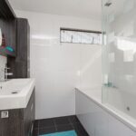De moderne en volledig betegelde badkamer is voorzien van een groot ligbad met jetstreams, breed badmeubel met wastafel en twee kranen, glad gestuct plafond met inbouwverlichting en raampartij.