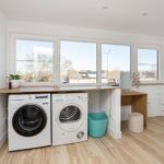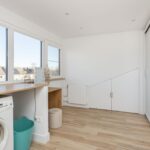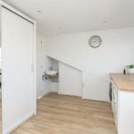 De grote slaapkamer aan de achterzijde is voorzien van de wasmachine- en drogeraansluiting met praktisch werkblad, wastafel, schuifkastenwand, CV-kast en bergruimte achter de knieschotten.