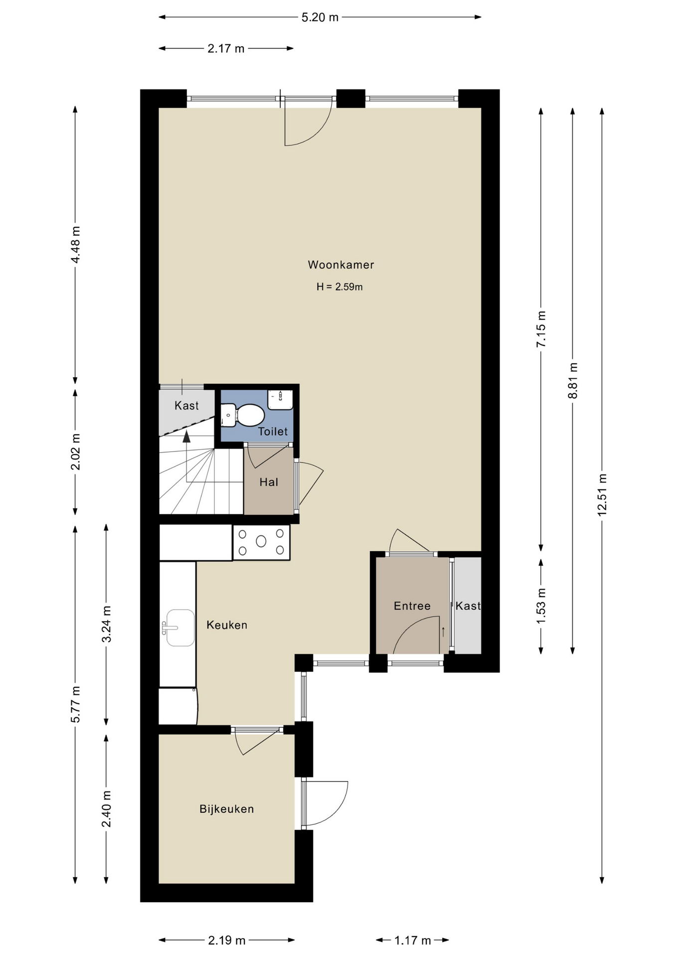 Vanuit de woonkamer is de tussenhal toegankelijk. Hier vind je de gemoderniseerde toiletruimte en de fraaie, met eikenhouten beklede trapopgang naar de 1e verdieping.
