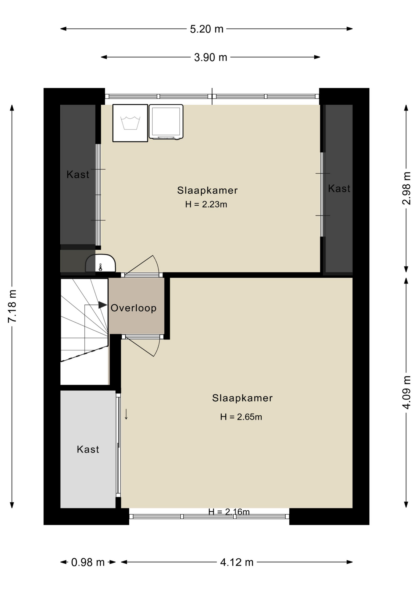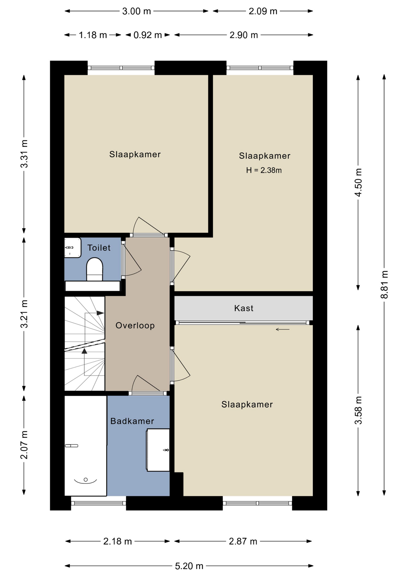 Via de vaste trap is de overloop bereikbaar, die toegang biedt tot de twee extra slaapkamers.
