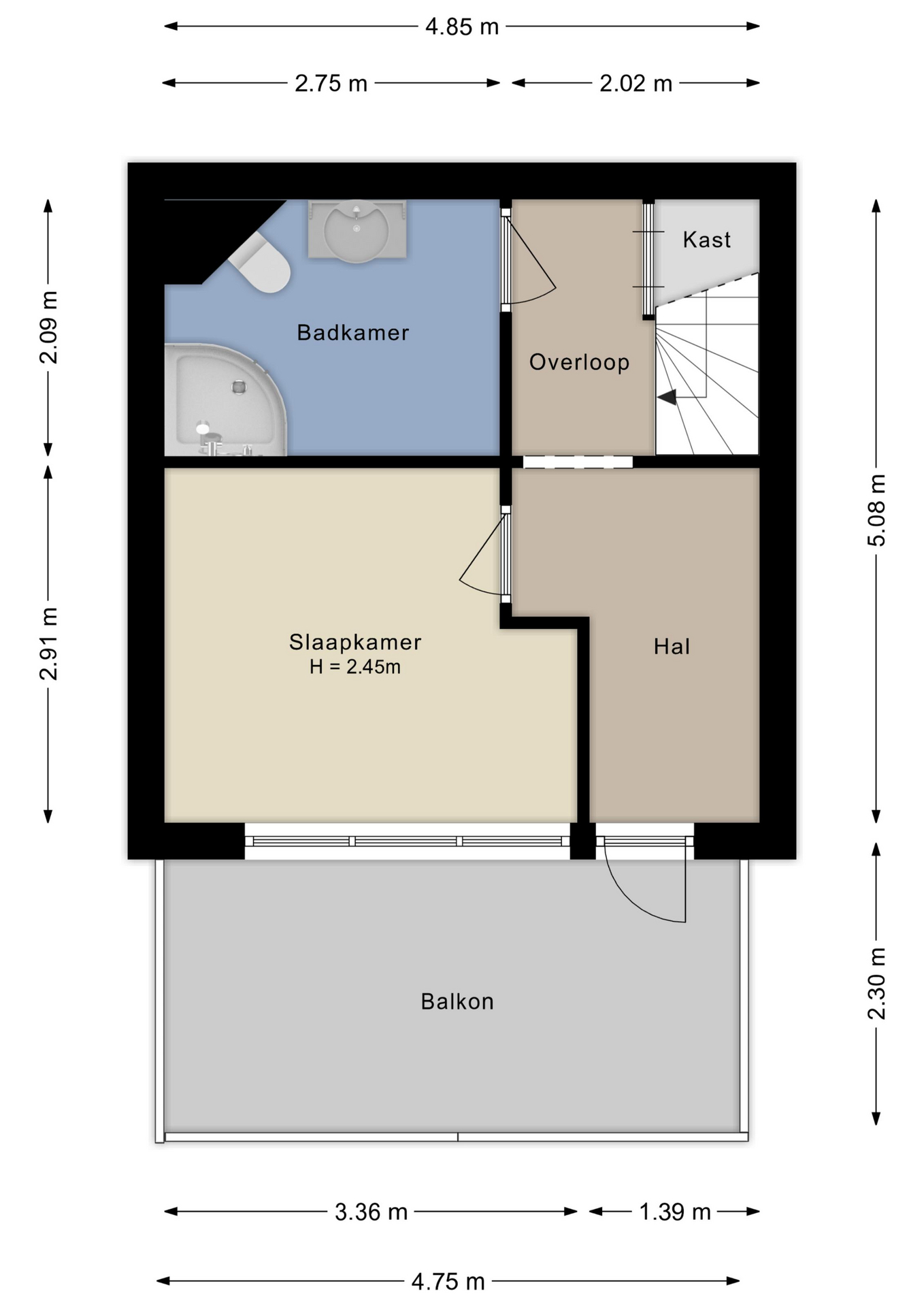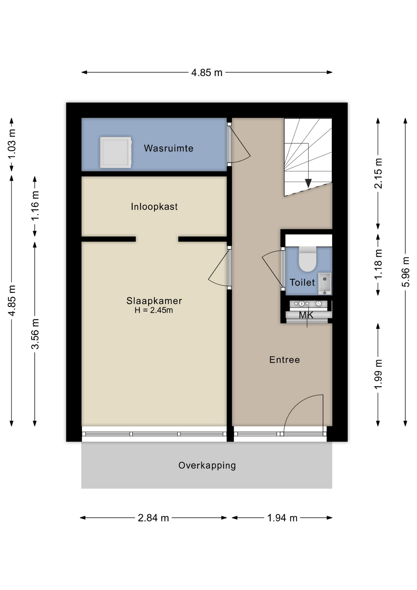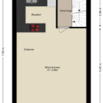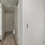 Via de eigen voordeur kom je binnen in de hal met meterkast en toegang tot het volledig betegelde toilet met fonteintje. Ook vind je hier een handige inpandige berging met aansluitingen voor wasapparatuur en de mechanische ventilatie-unit. De hal is voorzien van een tegelvloer. De slaapkamer is voorzien van een nette laminaatvloer en als extra pluspunt beschikt de kamer over een ruime, praktische inloopkast – ideaal voor wie op zoek is naar extra opbergruimte en overzicht