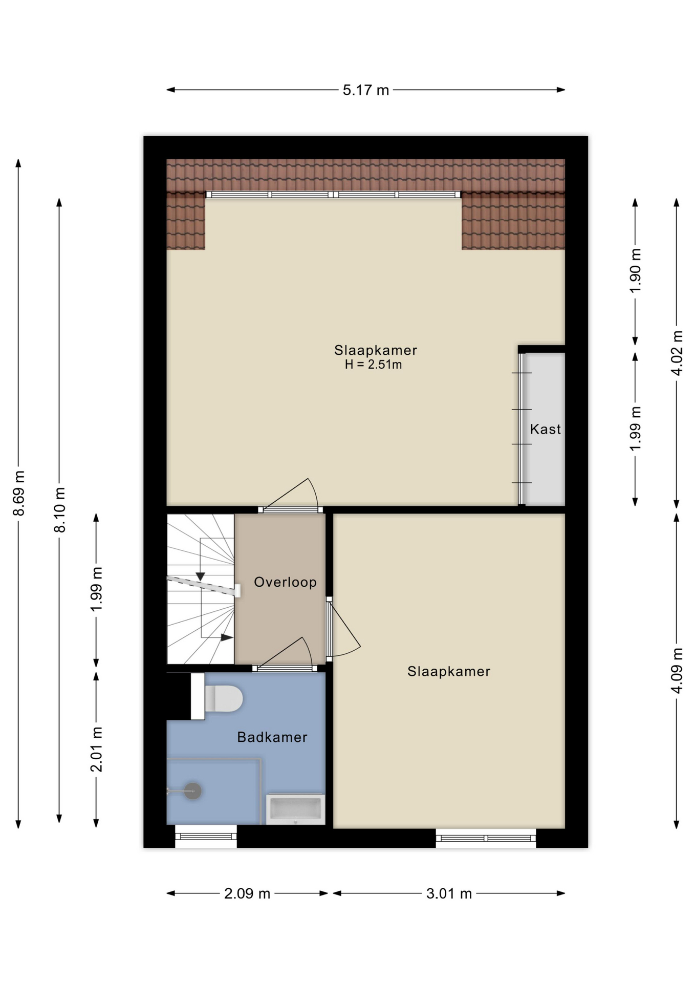 Op de eerste verdieping tref je twee ruim bemeten slaapkamers. De badkamer is modern uitgevoerd en voorzien van een douche, een toilet en een wastafel. Ga nog een verdieping hoger en ontdek de riante derde slaapkamer, voorzien van een praktische dakkapel die zorgt voor veel daglicht en extra ruimte.
