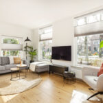 De ruime en lichte woonkamer heeft grote ramen aan de voorzijde en een prachtige houten vloer, wat zorgt voor een warme en sfeervolle leefruimte.