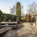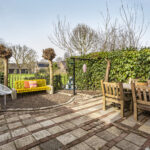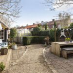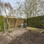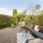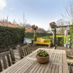 De woning beschikt over een ruime en sfeervolle achtertuin met meerdere terrassen, groenpartijen en veel privacy.