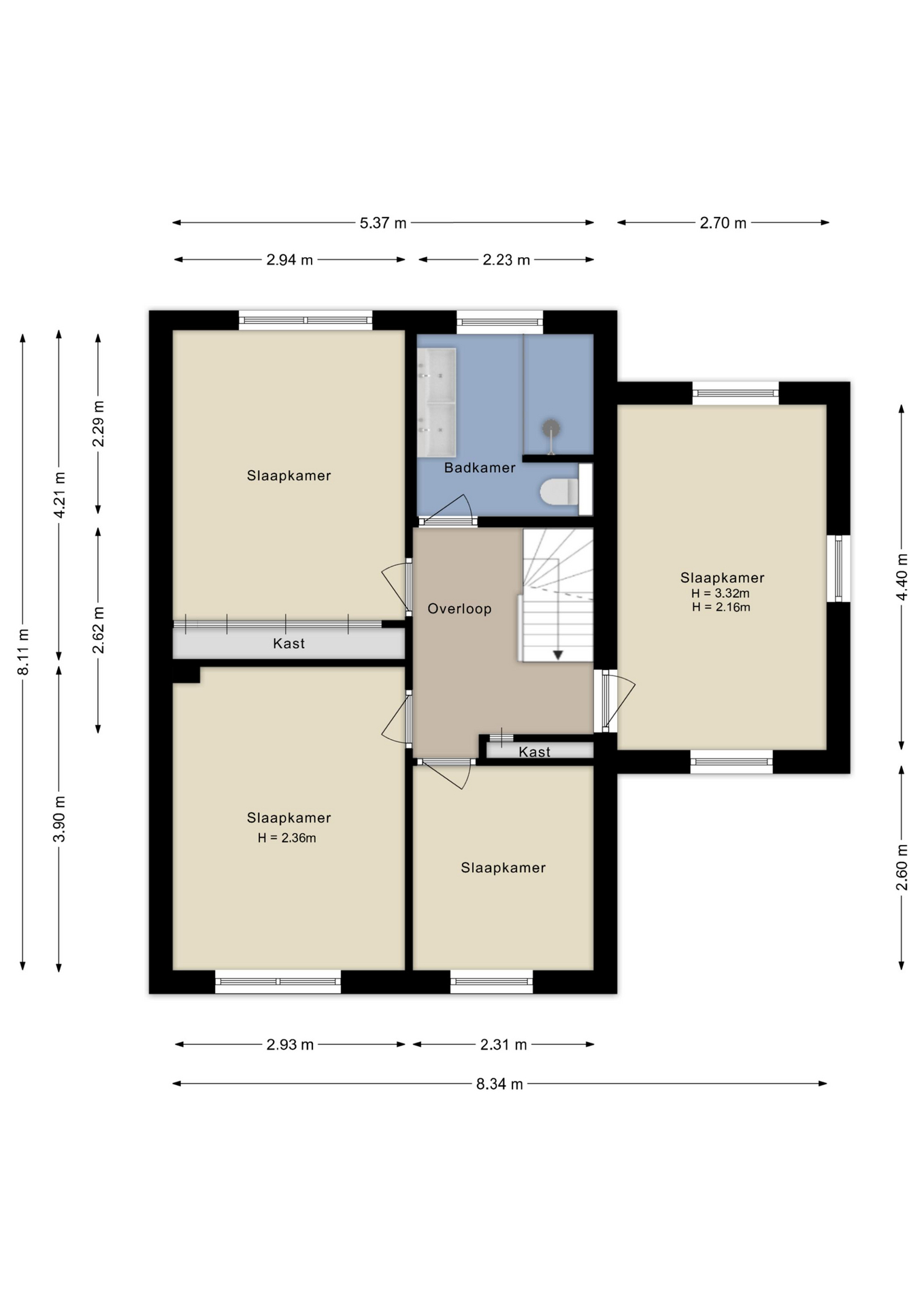 Op de eerste verdieping bevinden zich vier slaapkamers van goed formaat. De kamers zijn flexibel te gebruiken als slaap-, werk- of hobbykamer.