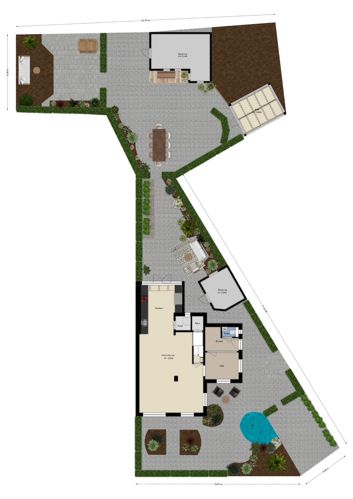 Daarnaast zijn er praktische bergingen en een overkapping, ideaal voor opslag, fietsen of hobbyruimte.