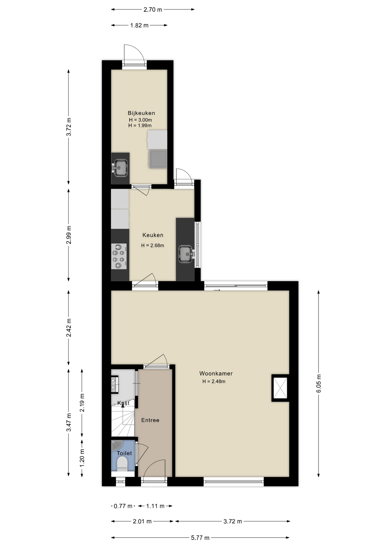 Bij binnenkomst tref je een lichte entree met toegang tot de hal, voorzien van een toilet en een trapkast met veel opbergruimte en de groepenkast. De ruime L-vormige woon- en eetkamer heeft veel lichtinval, een sfeervolle haard en groen uitzicht aan de voor- en achterzijde. De begane grond is voorzien van een prachtige eiken houten visgraatvloer met bies en via de schuifpui stap je zo de tuin in. Aangrenzend ligt de moderne keuken (in 2018 geplaatst). De keuken beschikt over een 5-pits gaskookplaat, oven, magnetron, koelkast, vriezer en afzuigkap. Aan de rechterkant van de keuken is een aanrechtblok met wasbak en extra werkruimte. Via de keuken kom je in de bijkeuken: een handige ruimte met wasmachine- en drogeraansluiting, extra wasbak, voldoende opbergruimte en de cv-ketel, netjes weggewerkt. Zowel de keuken, bijkeuken als de woonkamer hebben een toegang tot de tuin.