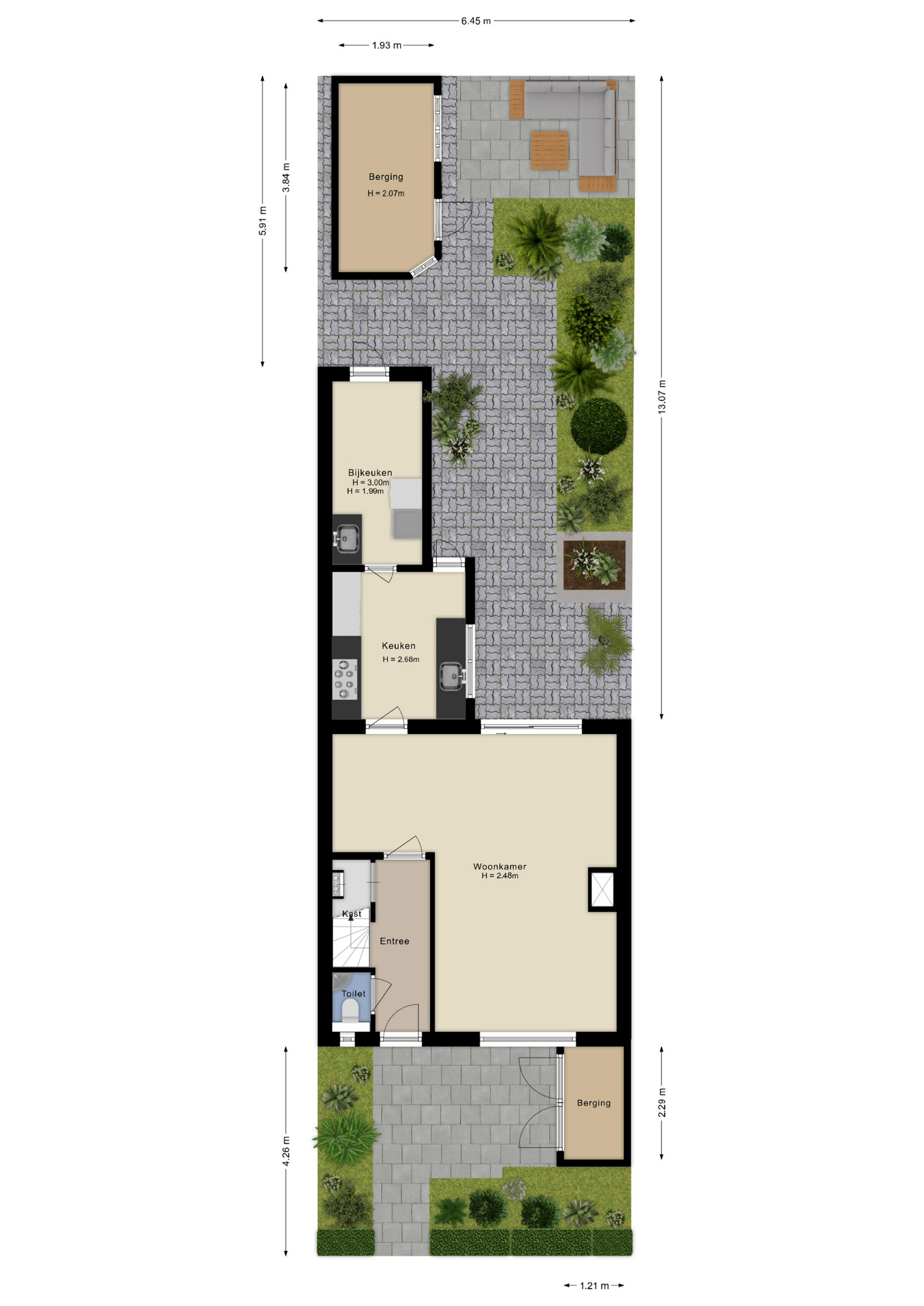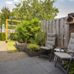 De voortuin ligt op het zuiden, zorgt voor extra privacy in de woonkamer en geeft een fijn, groen uitzicht op de wijk. Hier staat ook een kleine berging, ideaal voor de fiets of motor. De achtertuin, ca. 14 meter diep en gelegen op het noorden, is verzorgd, heeft een achterom en biedt volop privacy. Omdat de tuin zo diep is, heb je in het grootste deel van de tuin bijna de hele dag zon! Je kan hier in alle rust genieten van een kop koffie of een goed boek. Verder staat achterin een vrijstaande houten berging, handig voor fietsen, tuingereedschap en opslag.