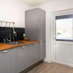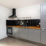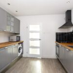 De ruime keuken is ingericht met een grijs keukenmeubel in een parallelopstelling, waardoor je extra werkruimte hebt. Het meubel is voorzien van een gaskookplaat, oven, afzuigkap, koelkast, vriezer, vaatwasser en wasmachine. Vanuit de keuken krijg je toegang tot het 2e balkon en de badkamer.