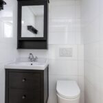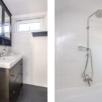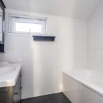 De badkamer is volledig betegeld en uitgerust met een bad/douchecombinatie, een wastafelmeubel, een spiegelkast en een designradiator.