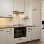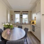 Vanuit de keuken kijk je door twee hoge ramen uit op de voortuin en straat. Je hebt de beschikking over een grote hoekkeuken die van vele gemakken is voorzien: een vaatwasser, koel-vriescombinatie, oven, gaskookplaat, afzuigkap, bovenkasten en wandtegels.