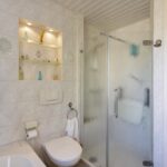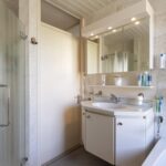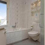 Het huis heeft een nette badkamer met daarin een ligbad, douche, wastafelmeubel, spiegelkast, toilet, raam en handige nis met spotverlichting.