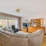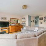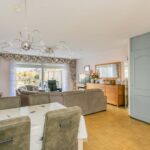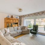 De ruim bemeten en tuingerichte woonkamer is voorzien van een eikenhouten parketvloer met convectorput, structuurverfwanden, trapkast, airco en brede glazen achterpui met schuifdeur en vrij uitzicht over de tuin en de singel.