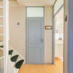 Hal met eikenhouten parketvloer, moderne toiletruimte met hangend closet en fonteintje, meterkast, trapopgang en deur naar de schuur.