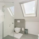 De geheel betegelde badkamer is modern van uitvoering en voorzien van een grote inloopdouche met thermostaatkraan, regen- en handdouche en zitje, badmeubel met wastafel, hangend closet, designradiator en Velux-dakraam met rolluik.