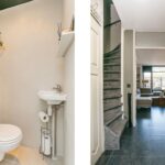 Hal met tegelvloer, moderne toiletruimte met hangend closet en fonteintje, meterkast, trapopgang en deur naar de woonkamer.