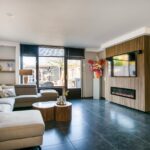 De sfeervolle en tuingerichte woonkamer is voorzien van een tegelvloer, glad gestucte wanden -en plafond, cinewall met elektrische haard, trapkast en deur naar de achtertuin.