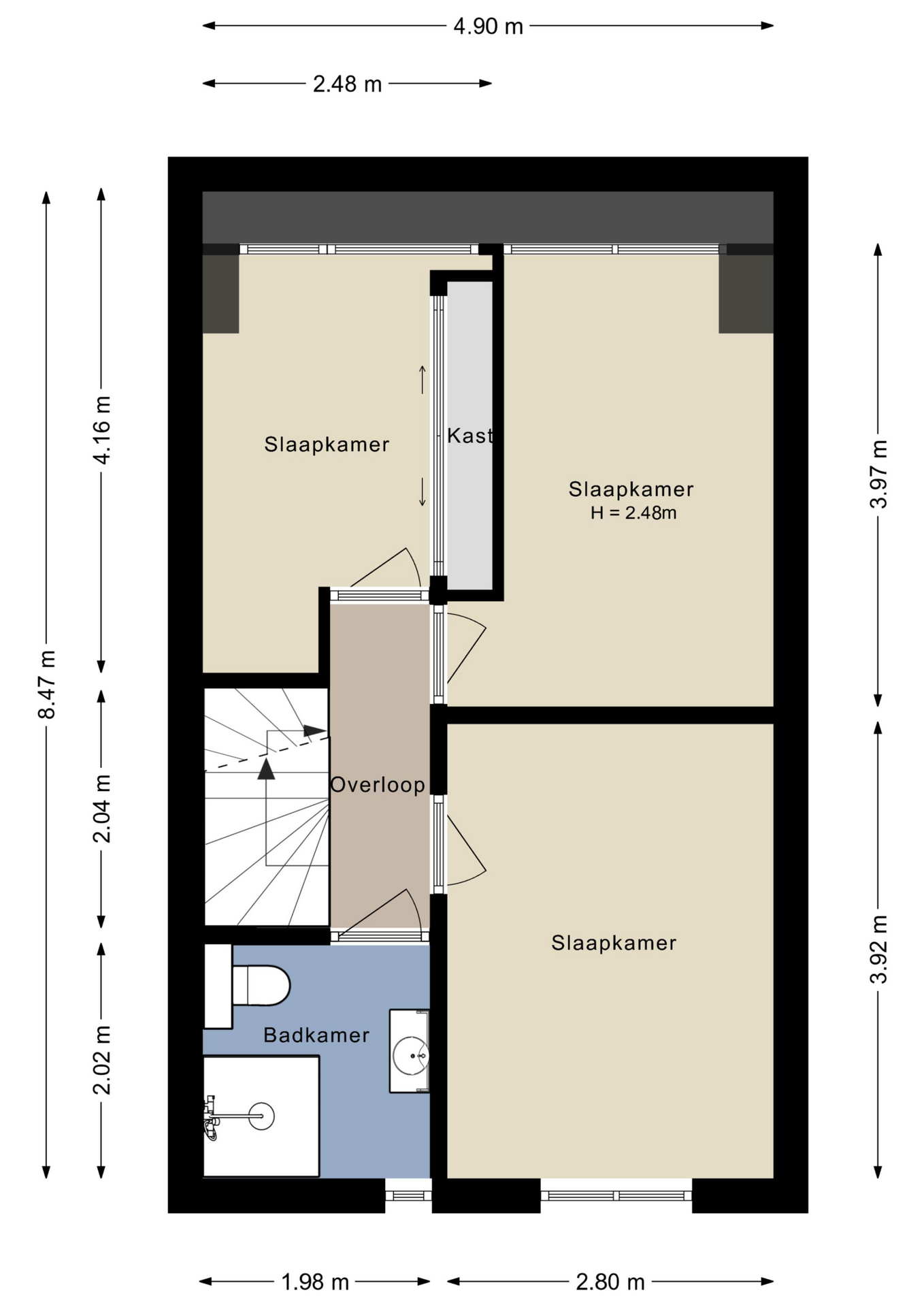 De 1e verdieping beschikt over drie slaapkamers van goede afmeting, die alle zijn voorzien van een laminaatvloer. De twee slaapkamers aan de achterzijde hebben een dakkapel met kunststof kozijnen en draai-/kiepramen en één kamer is tevens voorzien van een vaste schuifkastenwand.